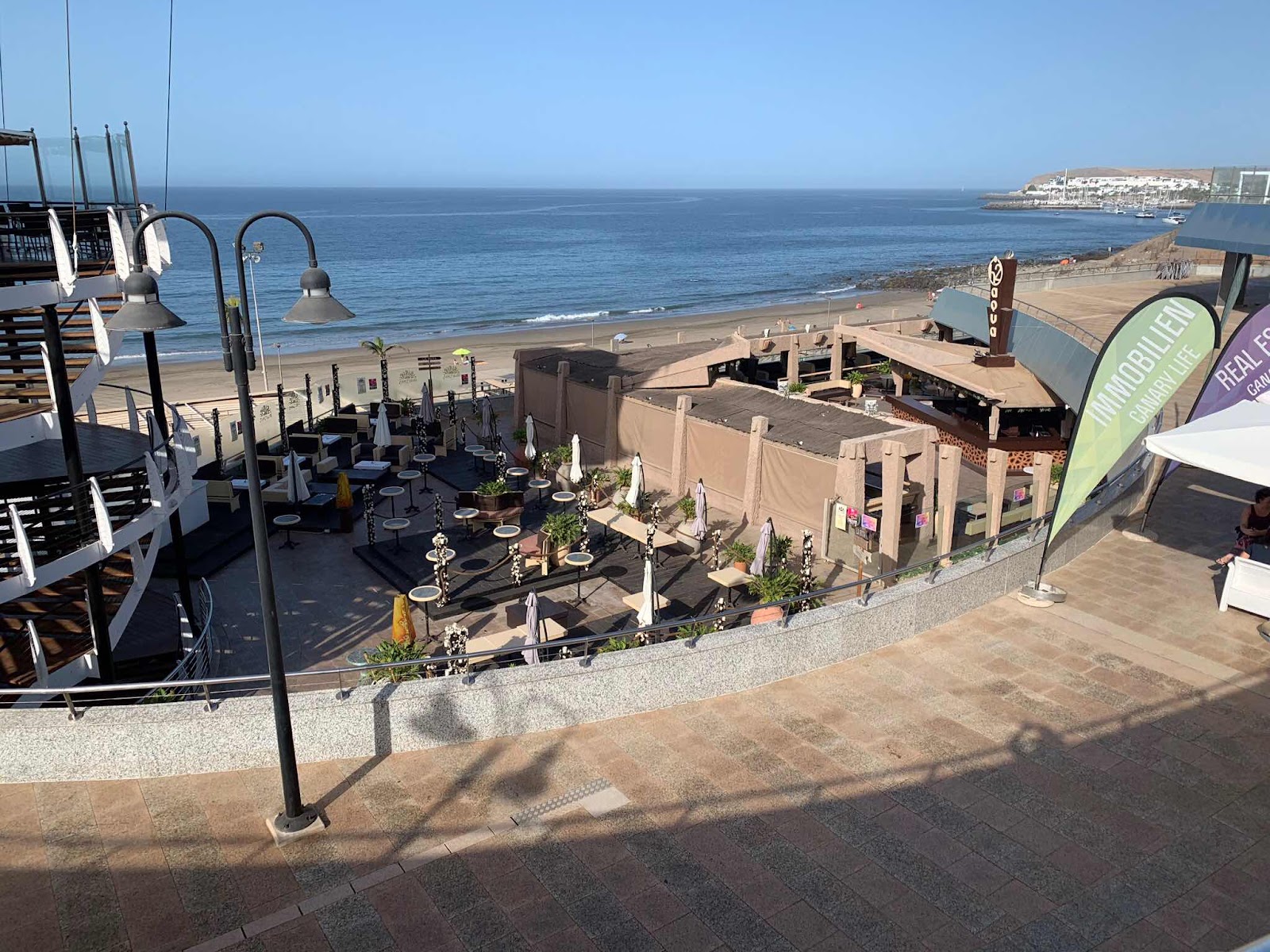 Hoy toca Las Palmas. He desayunado menos que ayer y va la cosa bastante bien. Antes de pillar la autovía, he decidido primero pasar por las playas cercanas a mi hotel. La primera, la playa de Meloneras. He llegado y la verdad es que no había nadie. Es una playa pequeña pero muy resguardada. Tiene todo un complejo delante de restaurantes y un pequeño paseo marítimo pero no pasan coches. Hay un aparcamiento subterráneo de pago justo en la playa. Yo he aparcado de gratis más arriba y así me he dado un paseo para bajar el desayuno.
